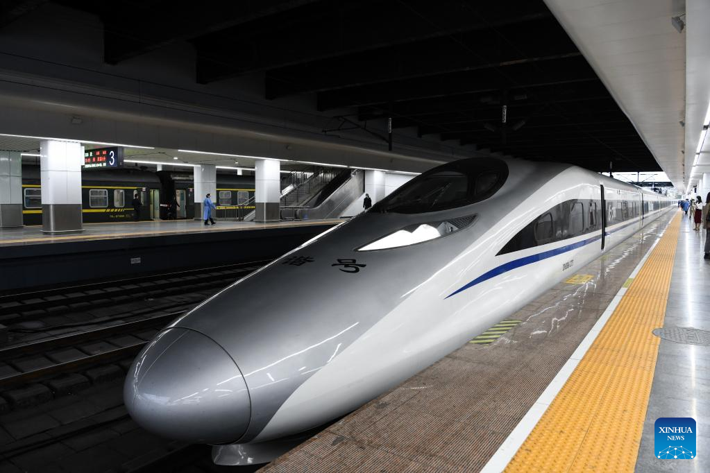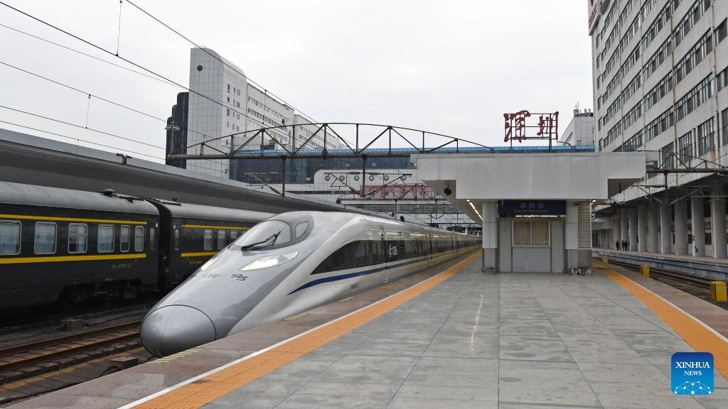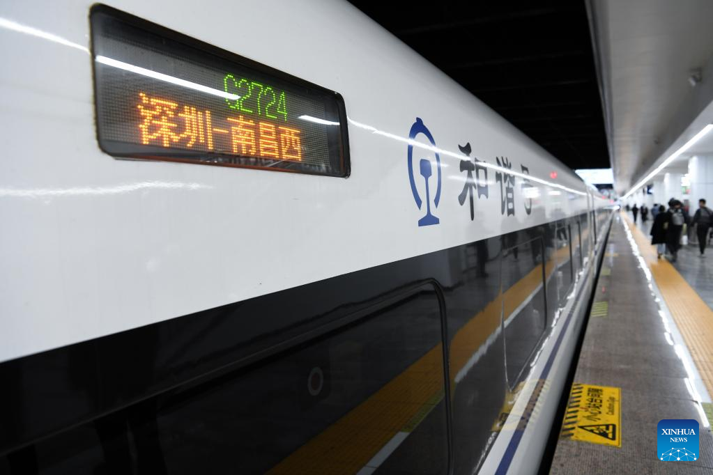 Train G2724 bound for Nanchang in east China's Jiangxi Province departs at Shenzhen Railway Station in Shenzhen, south China's Guangdong Province, Jan. 10, 2022. Train G2724 departed from the Shenzhen Railway Station on Monday which marks the departure of the first high-speed railway train from the century-old station. (Xinhua/Liang Xu)