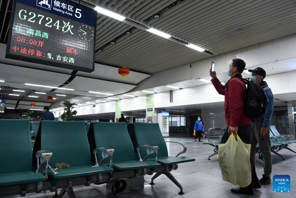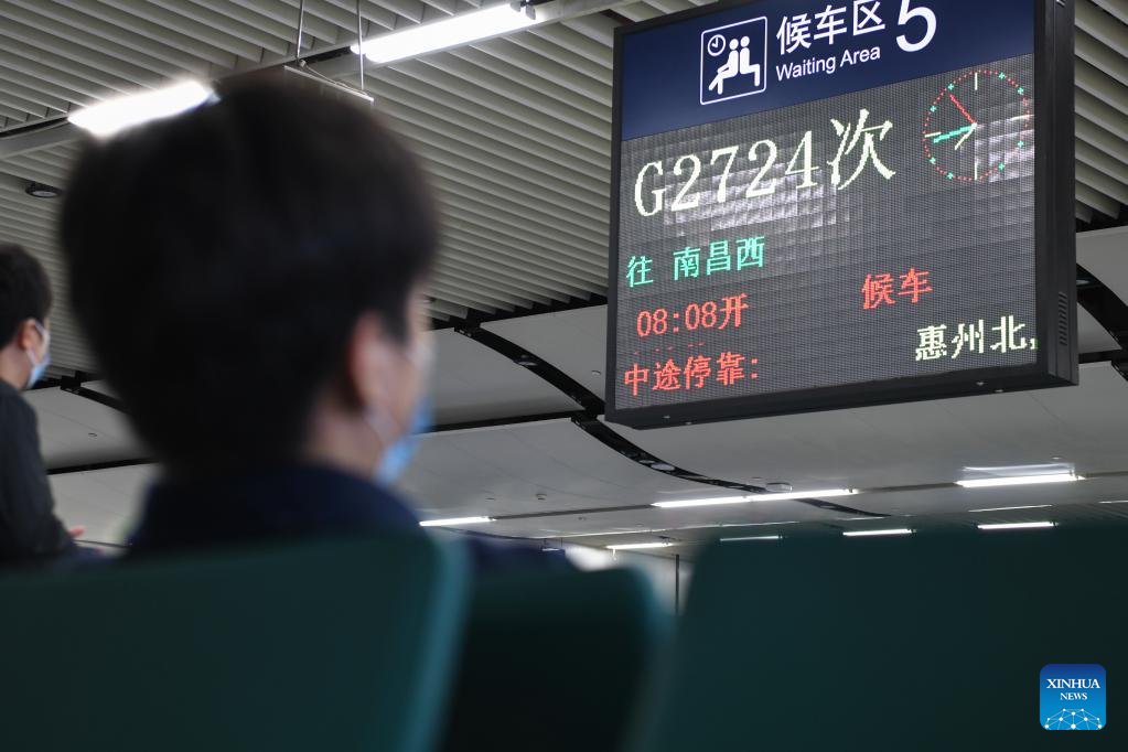 Passengers wait to board train at Shenzhen Railway Station in Shenzhen, south China's Guangdong Province, Jan. 10, 2022. Train G2724 departed from the Shenzhen Railway Station on Monday which marks the departure of the first high-speed railway train from the century-old station. (Xinhua/Liang Xu)