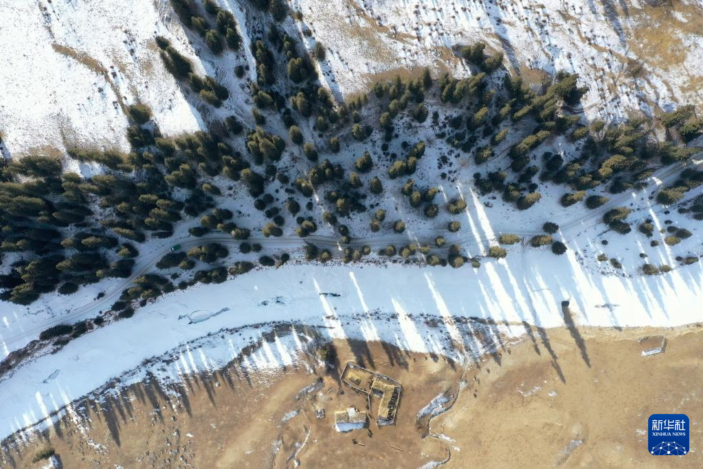 Aerial photo taken on Jan. 26, 2022 shows the scenery of Akyaz Valley in Zhaosu County, northwest China's Xinjiang Uygur Autonomous Region. Herdsmen in Xinjiang had lived a nomadic life for centuries. Under a housing project to benefit hundreds of households of local herdsmen, local authorities have initiated construction of supporting facilities to help herdsmen's settlement. It helps herdsmen to start a new life with better medical, educational, cultural and health facilities. (Xinhua/Ding Lei)