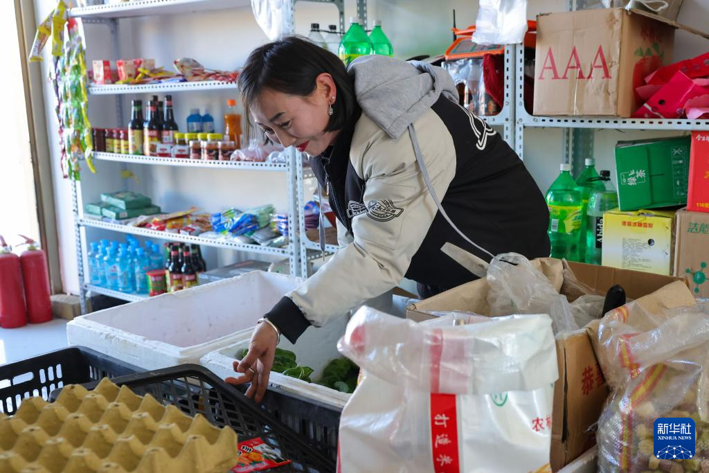 A woman organizes supplies at her shop in Karadala Township of Tekes County, northwest China's Xinjiang Uygur Autonomous Region, Jan. 27, 2022. Herdsmen in Xinjiang had lived a nomadic life for centuries. Under a housing project to benefit hundreds of households of local herdsmen, local authorities have initiated construction of supporting facilities to help herdsmen's settlement. It helps herdsmen to start a new life with better medical, educational, cultural and health facilities. (Xinhua/Ding Lei)