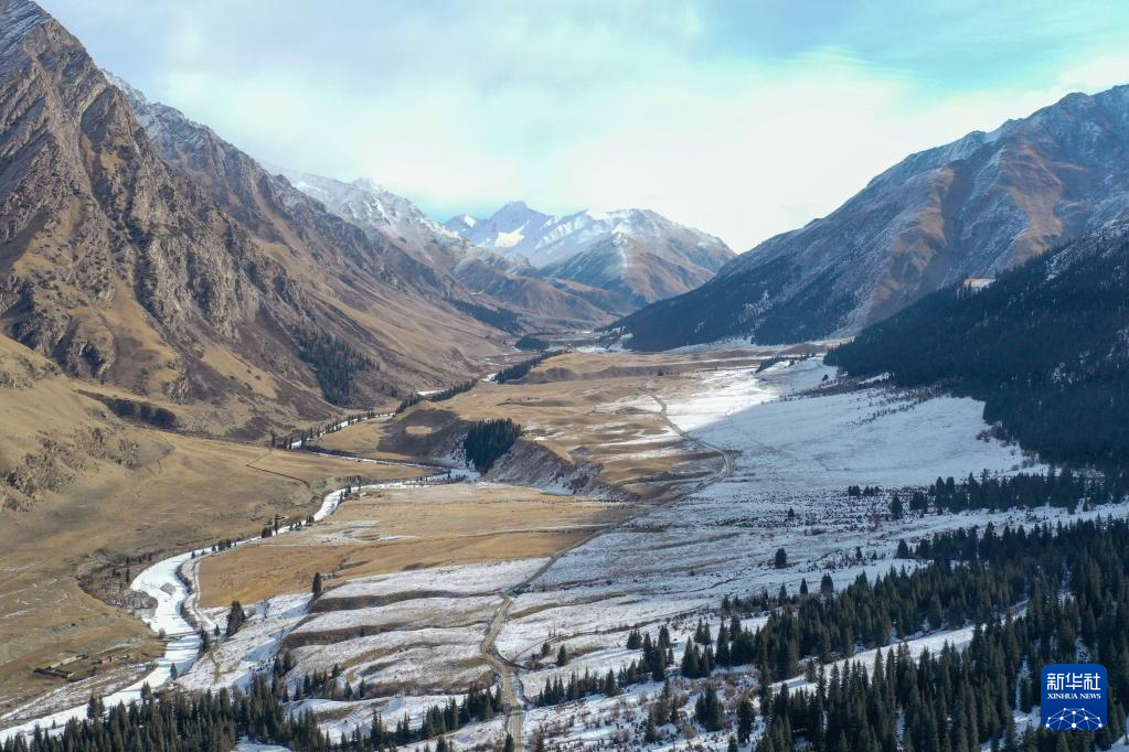 Aerial photo taken on Jan. 26, 2022 shows the scenery of Akyaz Valley in Zhaosu County, northwest China's Xinjiang Uygur Autonomous Region. Herdsmen in Xinjiang had lived a nomadic life for centuries. Under a housing project to benefit hundreds of households of local herdsmen, local authorities have initiated construction of supporting facilities to help herdsmen's settlement. It helps herdsmen to start a new life with better medical, educational, cultural and health facilities. (Xinhua/Li Zhihao)