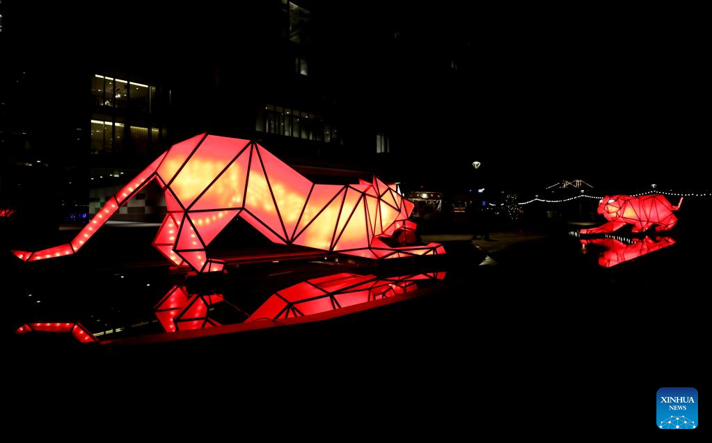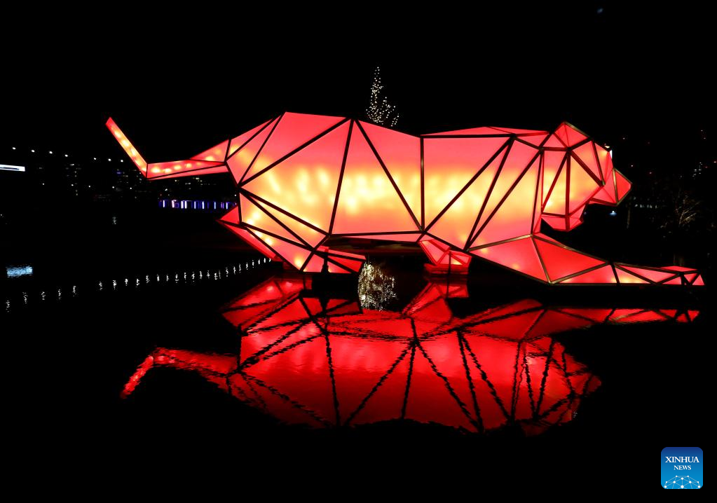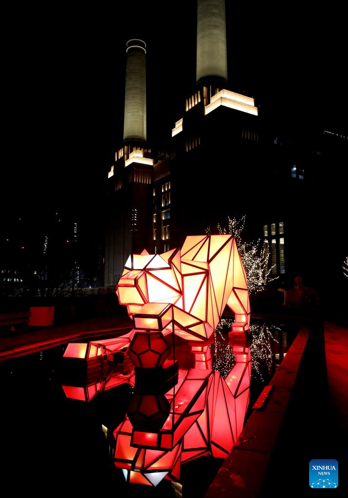 An installation called Digital Origami Tiger is seen during the Light Festival at Battersea Power Station in London, Britain, Feb. 17, 2022. The Light Festival is held from Jan. 13 to Feb. 27, 2022. (Xinhua/Li Ying)