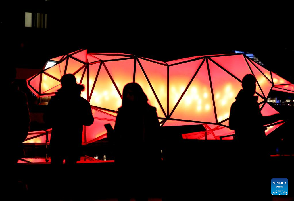 People view an installation called Digital Origami Tiger during the light festival at Battersea Power Station in London, Britain, Feb. 17, 2022. The Light Festival is held from Jan. 13 to Feb. 27, 2022. (Xinhua/Li Ying)
