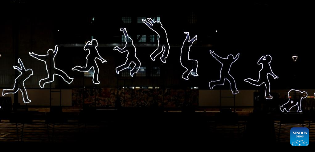 An installation called Run Beyond is seen during the Light Festival at Battersea Power Station in London, Britain, Feb. 17, 2022. The Light Festival is held from Jan. 13 to Feb. 27, 2022. (Xinhua/Li Ying)