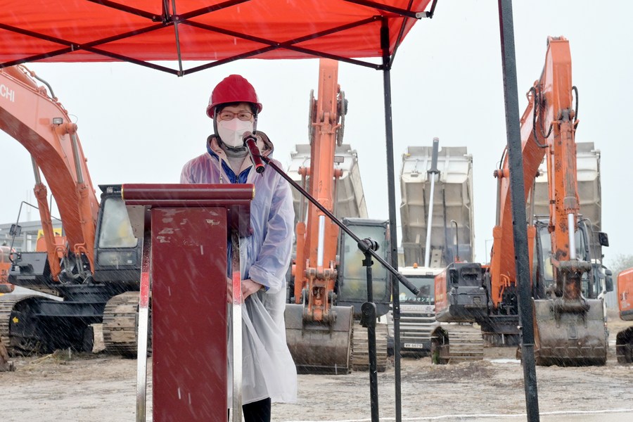 HKSAR Chief Executive Carrie Lam speaks at the commencement ceremony held at Penny's Bay quarantine site in south China's Hong Kong on Feb. 19, 2022. (Xinhua)