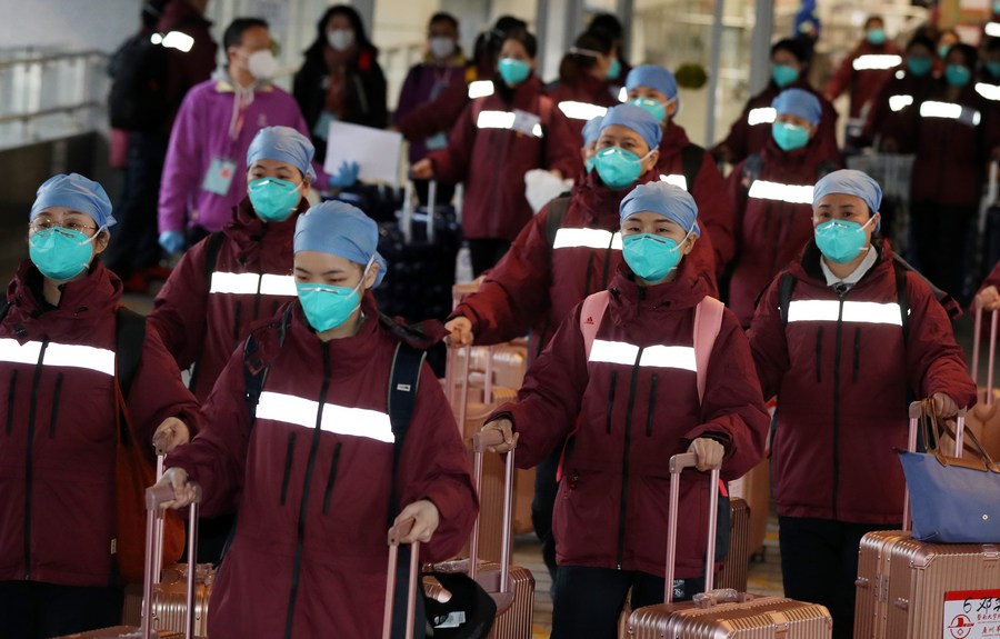 The second anti-pandemic work group from the Chinese mainland to support the COVID-19 control efforts of the Hong Kong Special Administrative Region (HKSAR) arrives at south China's Hong Kong, Feb. 19, 2022. (Xinhua/Li Gang)