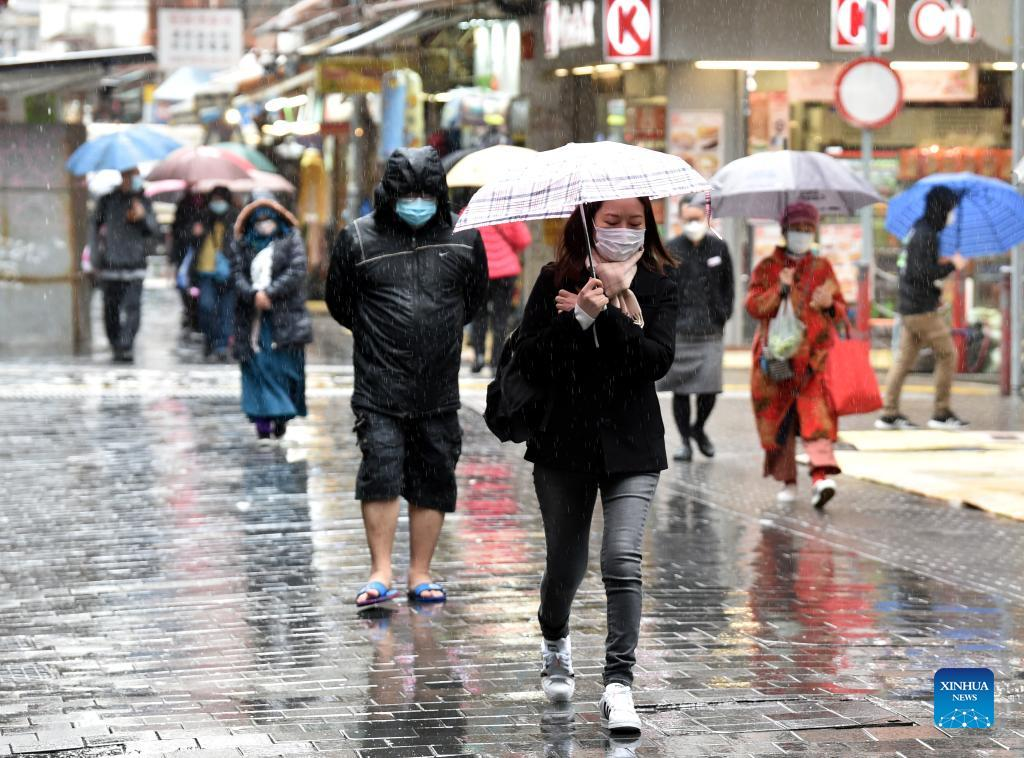People wearing face masks walk on a street in Hong Kong, south China, Feb. 21, 2022. Hong Kong on Monday reported 7,533 new cases and 13 deaths of COVID-19, official data showed. (Xinhua/Lo Ping Fai)
