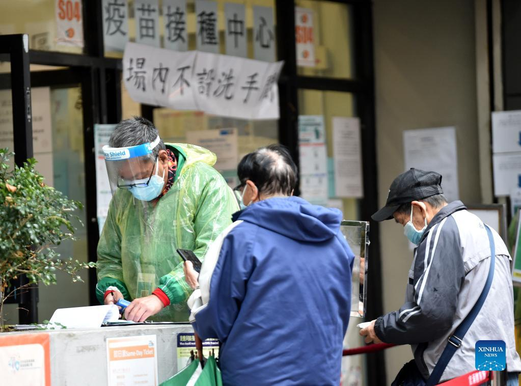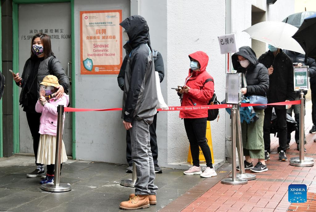 Citizens wearing face masks queue up to take COVID-19 vaccines at a vaccination site in Hong Kong, south China, Feb. 22, 2022. Hong Kong reported 6,211 new COVID-19 cases on Tuesday, official data showed. (Xinhua/Lo Ping Fai)