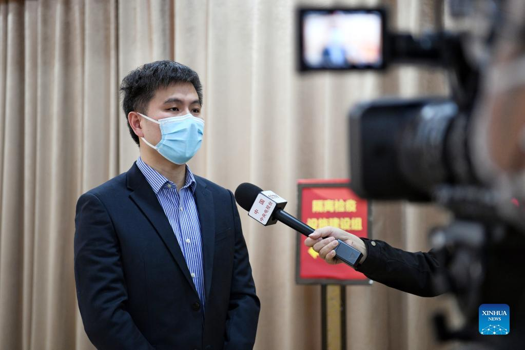 Xie Hui, a member of the construction team from the mainland which helps build mobile cabin hospitals, speaks in an interview with media in Hong Kong, south China, Feb. 22, 2022. The construction of four temporary community isolation and treatment facilities, or mobile cabin hospitals, for COVID-19 patients, began on Tuesday in Hong Kong with the support of the central government. (Xinhua)