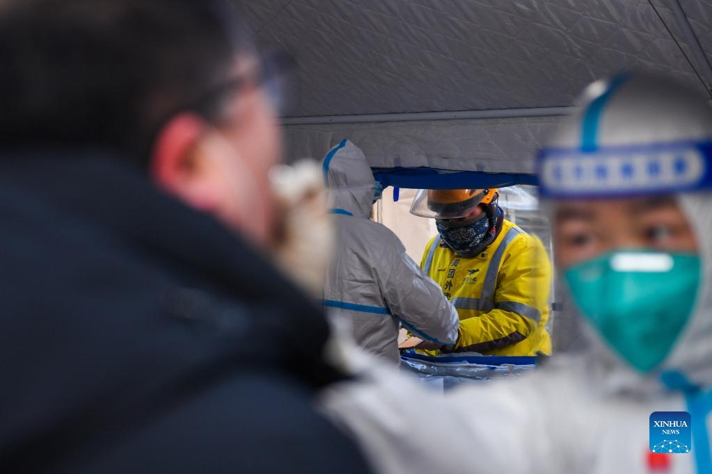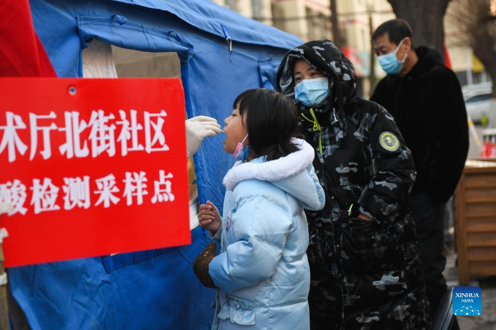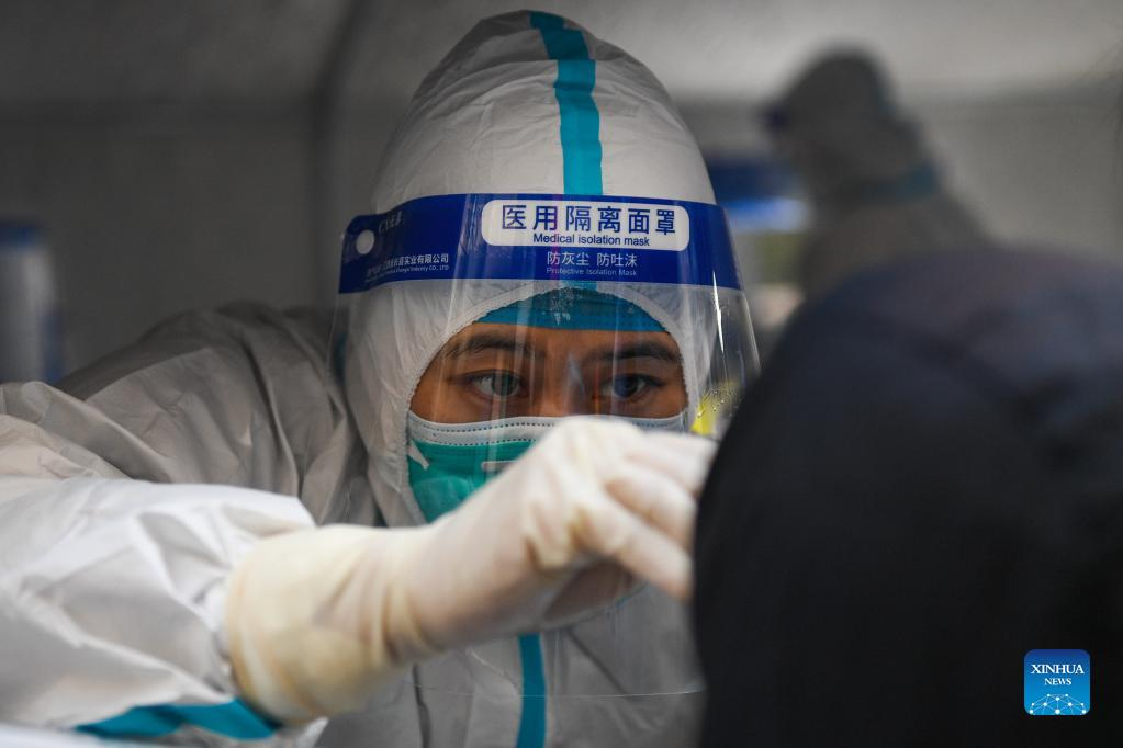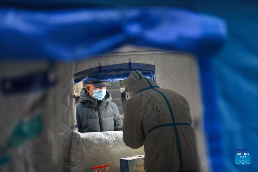 A medical staff collects a swab sample for nucleic acid testing at a community in Hohhot, north China's Inner Mongolia Autonomous Region, Feb. 24, 2022. Hohhot launched its sixth round of COVID-19 nucleic acid testing on Thursday. (Xinhua/Liu Lei)