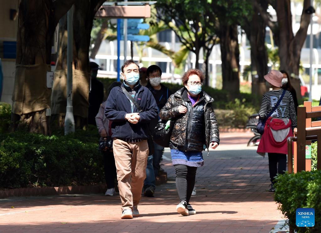 People wearing masks walk on road in Hong Kong, south China, Feb. 27, 2022. Hong Kong reported 26,026 new COVID-19 cases on Sunday, official data showed. (Xinhua/Lo Ping Fai)