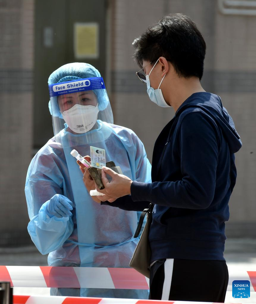 A staff member guides a citizen receiving COVID-19 test at Tsing Yi mobile test site in Hong Kong, south China, Feb. 27, 2022. Hong Kong reported 26,026 new COVID-19 cases on Sunday, official data showed. (Xinhua/Lo Ping Fai)
