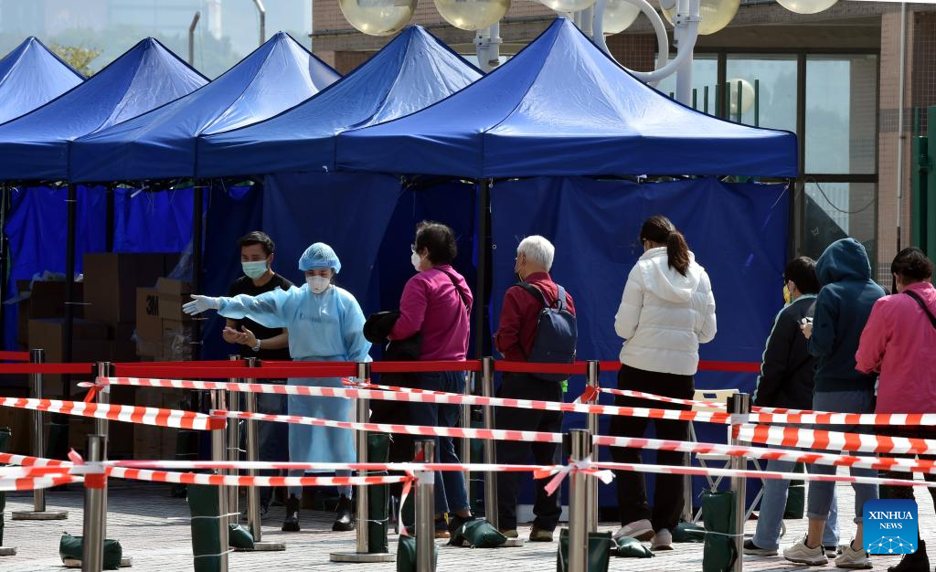 People queue up for COVID-19 tests at Tsing Yi mobile test site in Hong Kong, south China, Feb. 27, 2022. Hong Kong reported 26,026 new COVID-19 cases on Sunday, official data showed. (Xinhua/Lo Ping Fai)