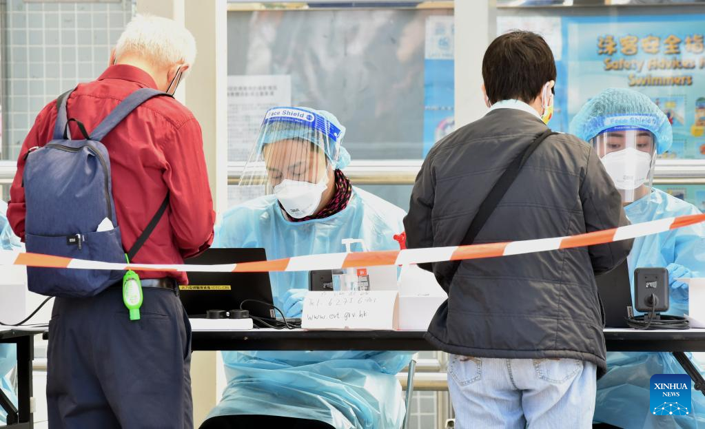 Staff members register information for people receiving COVID-19 tests at Tsing Yi mobile test site in Hong Kong, south China, Feb. 27, 2022. Hong Kong reported 26,026 new COVID-19 cases on Sunday, official data showed. (Xinhua/Lo Ping Fai)
