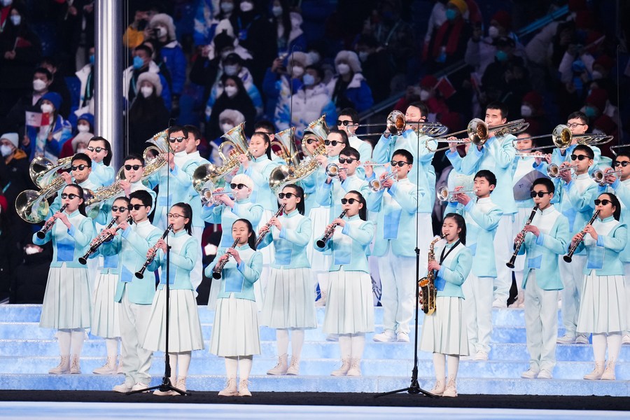 A band comprised of visually-impaired children plays the Paralympic Anthem during the opening ceremony of the Beijing 2022 Paralympic Winter Games at the National Stadium in Beijing, capital of China, March 4, 2022. (Xinhua/Wu Zhuang)
