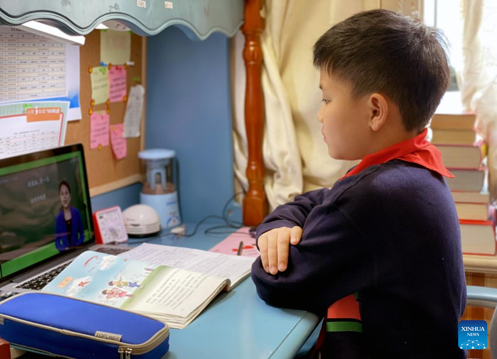 A pupil studies online at home in Shanghai, east China, March 14, 2022. Starting from Saturday, all primary and secondary schools in Shanghai have switched to online classes in response to latest rebound of COVID-19 cases. (Xinhua)
