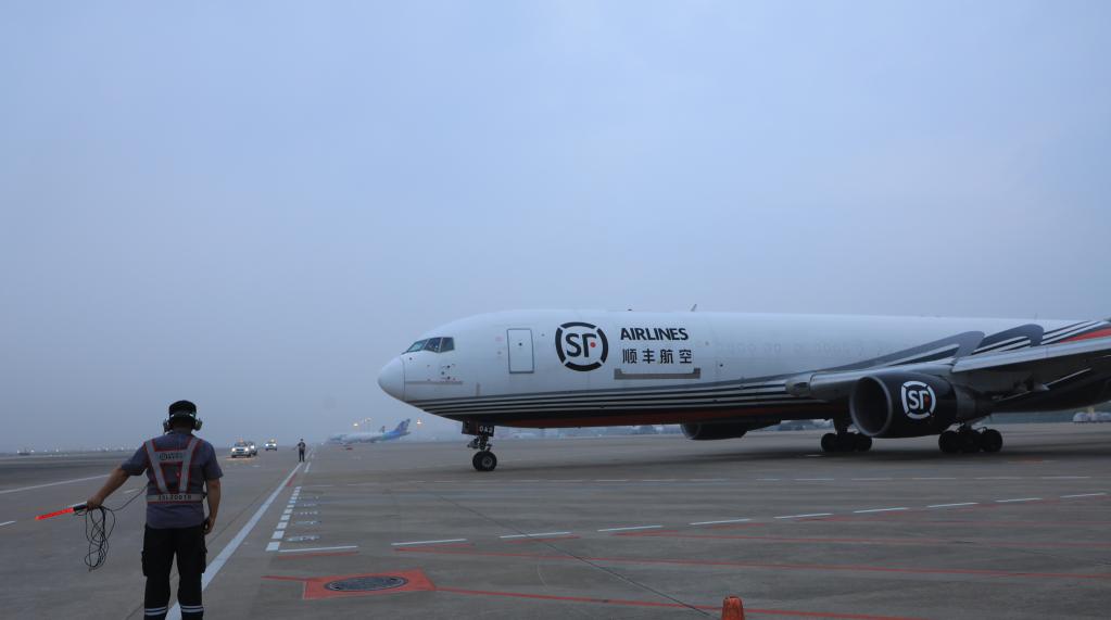 A Boeing 767 freighter carrying 45 tonnes of goods is seen at the Bao'an International Airport in Shenzhen, south China's Guangdong Province, March 19, 2022. The southern Chinese metropolis of Shenzhen has launched a chartered air-freight service to Hong Kong, starting Saturday. Early on Saturday morning, a Boeing 767 freighter operated by SF Airlines left Shenzhen for its neighbor Hong Kong, carrying 45 tonnes of goods, including donated anti-pandemic materials and also export goods from local businesses. The freighter will fly six times a week, with the chartered service initially planned to last until early April. (Xinhua)