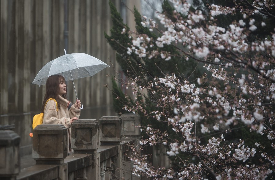 A tourist views cherry blossoms at Wuhan University in Wuhan, capital of central China's Hubei Province, March 8, 2021. (Xinhua/Xiao Yijiu)