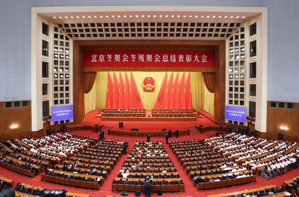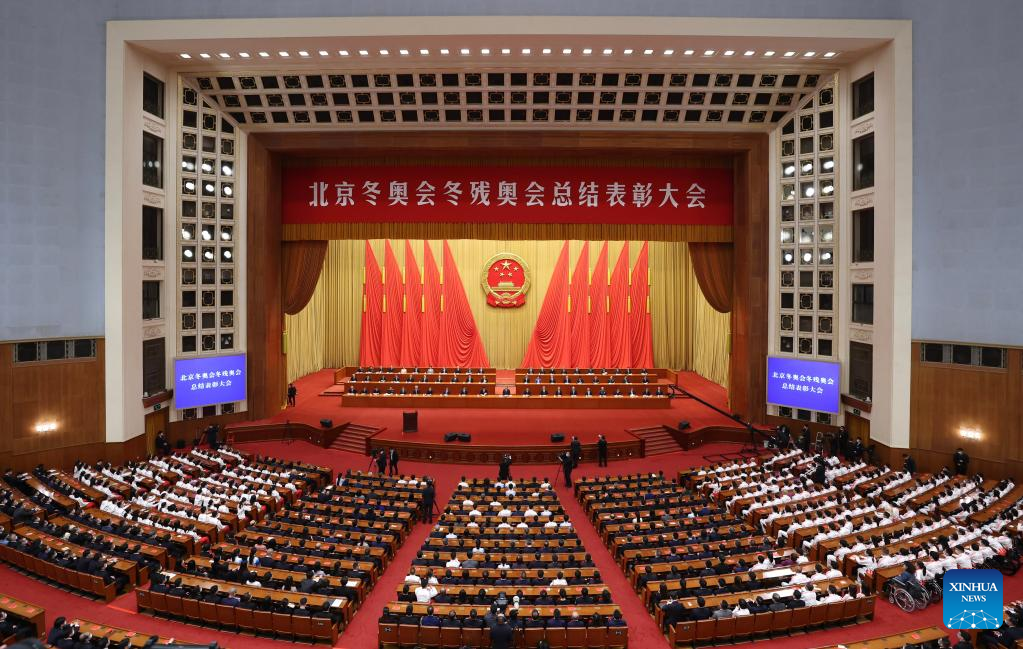 A gathering to honor those who have made outstanding contributions to the Beijing 2022 Olympic Winter Games and the Beijing 2022 Paralympic Winter Games is held at the Great Hall of the People in Beijing, capital of China, April 8, 2022. (Xinhua/Shen Hong)