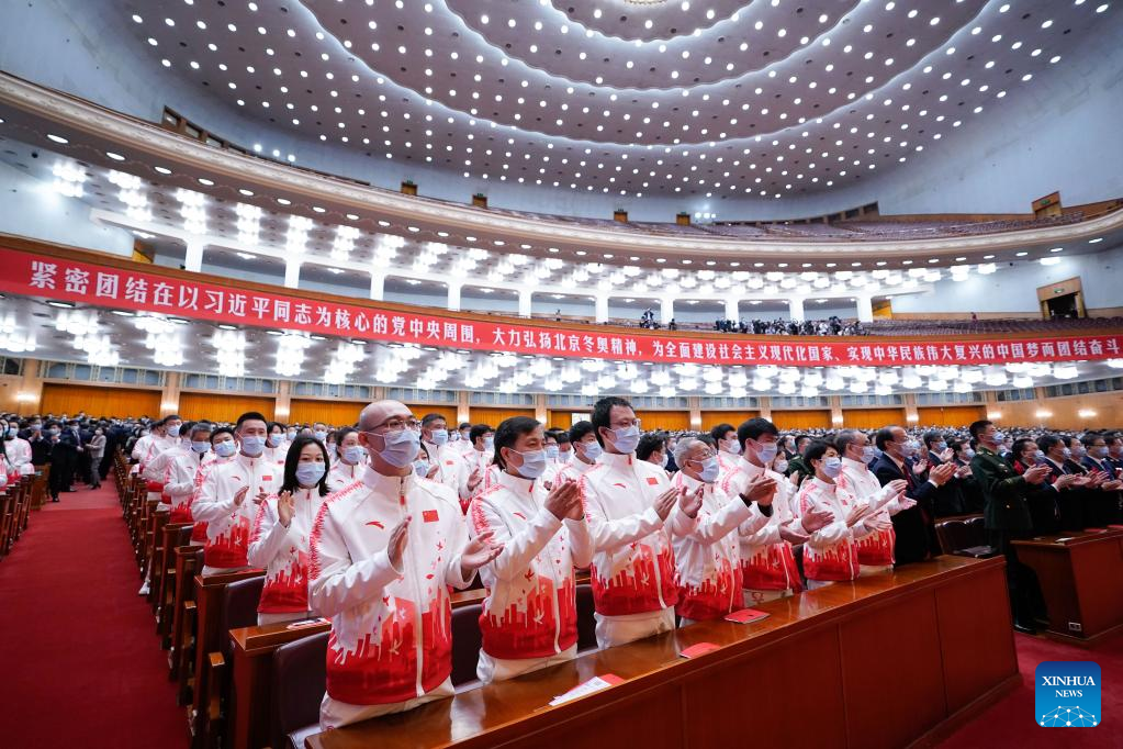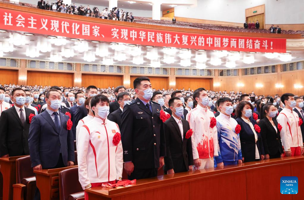 A gathering to honor those who have made outstanding contributions to the Beijing 2022 Olympic Winter Games and the Beijing 2022 Paralympic Winter Games is held at the Great Hall of the People in Beijing, capital of China, April 8, 2022. (Xinhua/Zhai Jianlan)