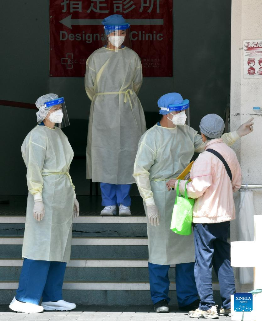 Medical workers guide a citizen at a designated clinic in Hong Kong, south China, April 9, 2022. On Saturday, Hong Kong registered a total of 2,535 new COVID-19 infections, including 897 by nucleic acid tests and 1,638 additional cases through self-reported rapid antigen tests, official data showed. (Xinhua/Lo Ping Fai)