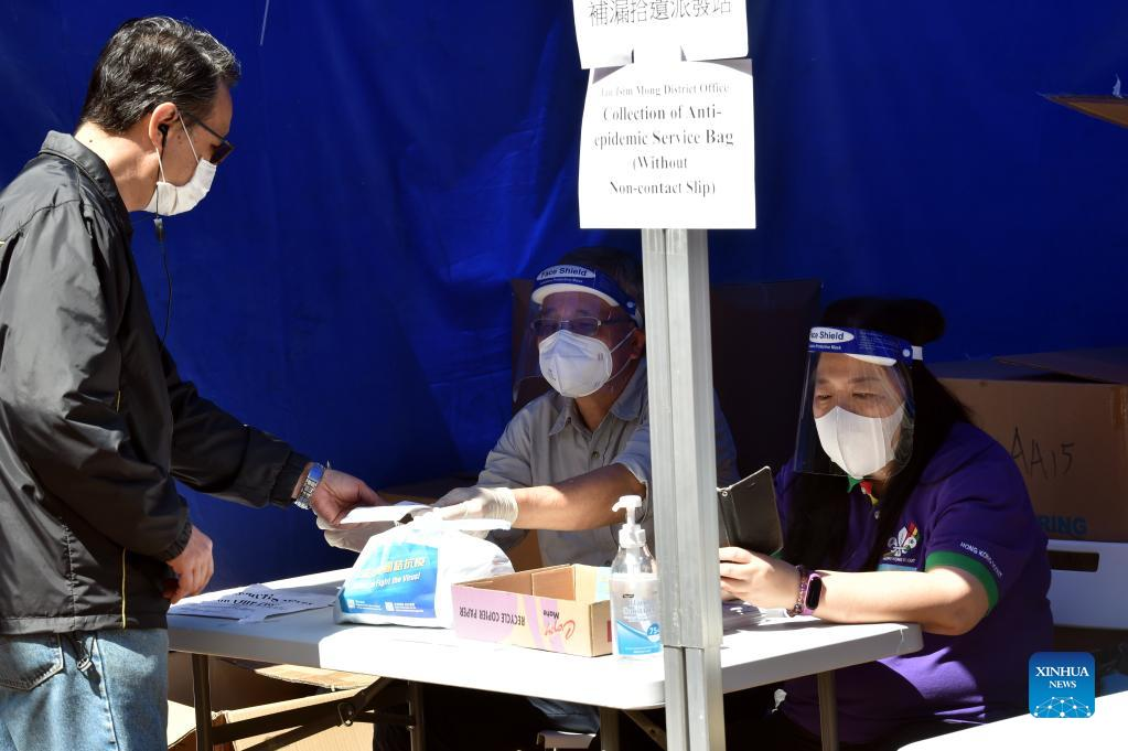 A citizen receives an anti-epidemic kit in Hong Kong, south China, April 9, 2022. On Saturday, Hong Kong registered a total of 2,535 new COVID-19 infections, including 897 by nucleic acid tests and 1,638 additional cases through self-reported rapid antigen tests, official data showed. (Xinhua/Lo Ping Fai)