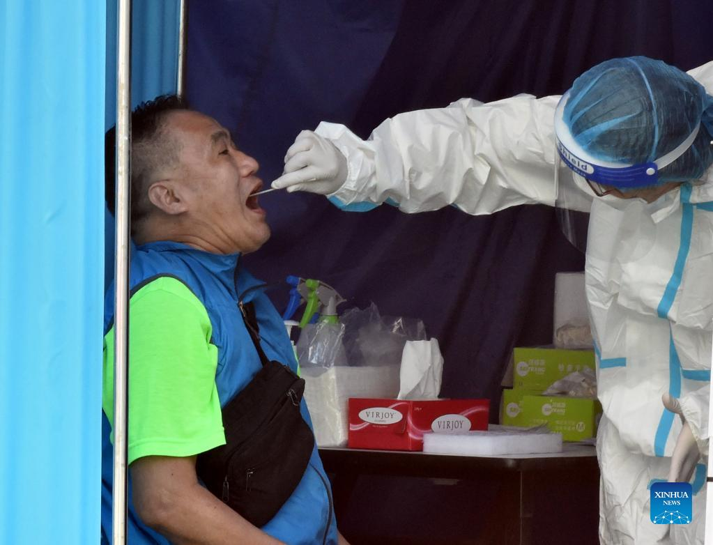 A citizen takes COVID-19 nucleic acid test in Hong Kong, south China, April 9, 2022. On Saturday, Hong Kong registered a total of 2,535 new COVID-19 infections, including 897 by nucleic acid tests and 1,638 additional cases through self-reported rapid antigen tests, official data showed. (Xinhua/Lo Ping Fai)