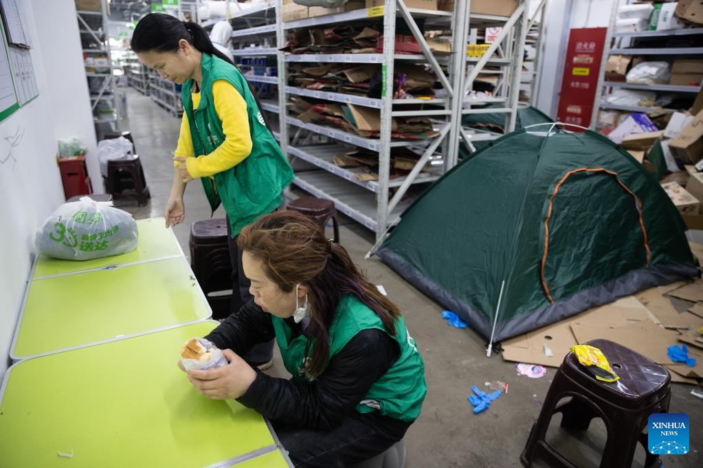 Staff members have breakfast at the outlet division of Meituan Maicai in east China's Shanghai, April 12, 2022.