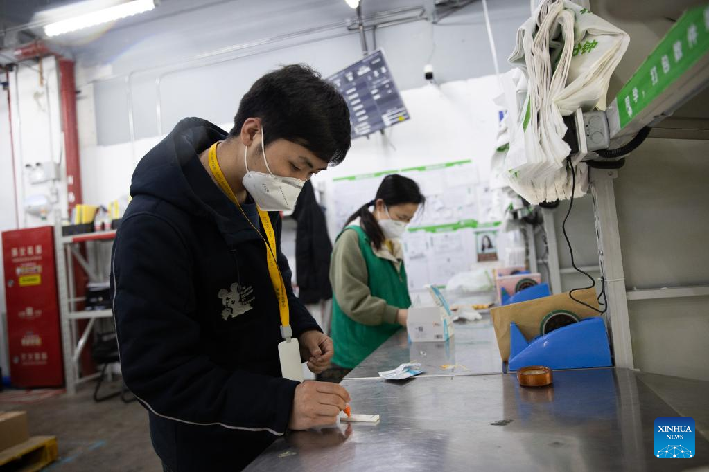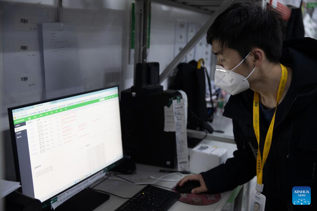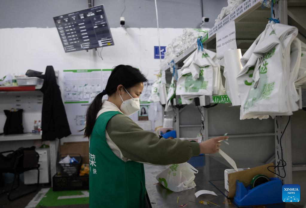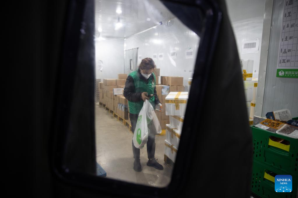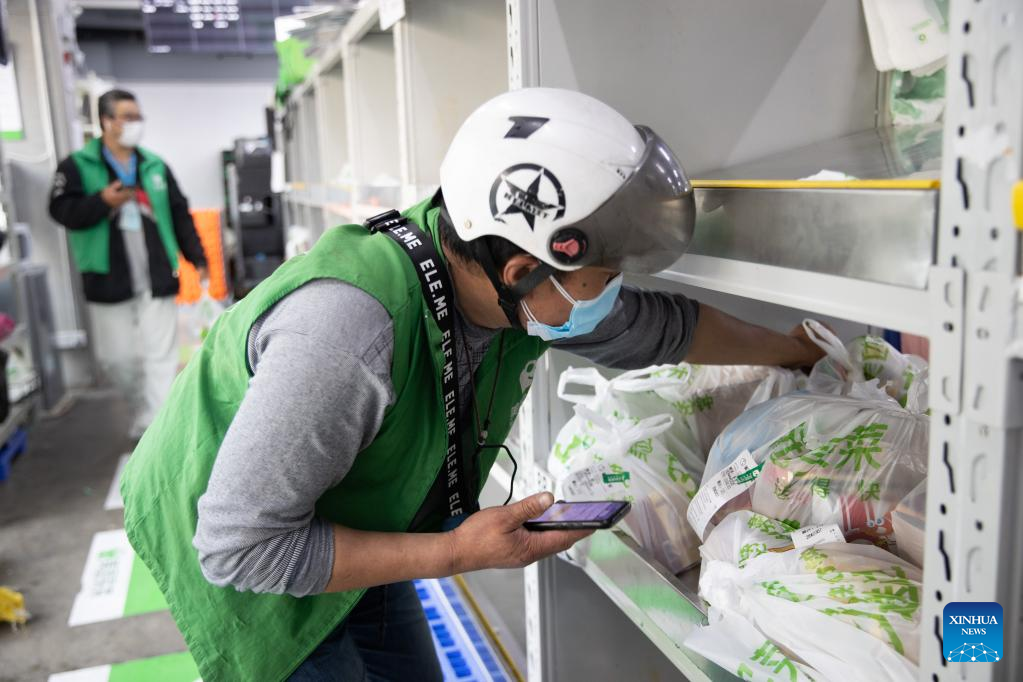 A deliveryman takes online orders at the outlet division of Meituan Maicai in east China's Shanghai, April 12, 2022.