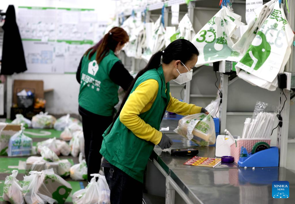 Staff members sort and pack the ordered groceries at the outlet division of Meituan Maicai in east China's Shanghai, April 12, 2022.