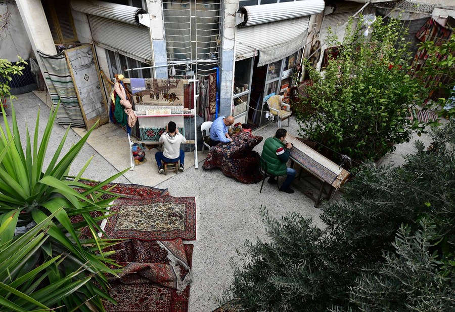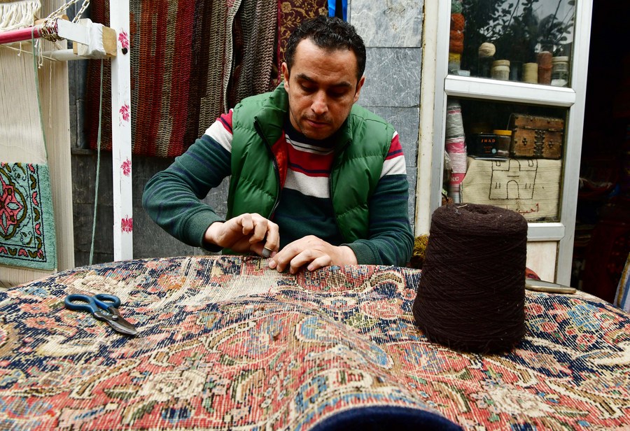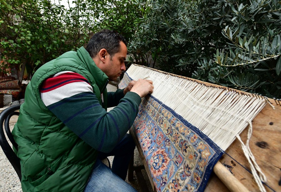 Omar Rawas, a carpet weaver, is seen fixing carpets at his workshop in Syria's northern city of Aleppo on March 8, 2022. (Photo by Ammar Safarjalani/Xinhua)