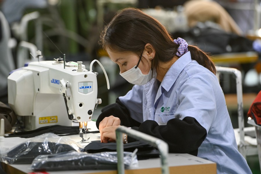 A staff member works in a clothing factory at the integrated industrial park in Moyu County of Hotan, northwest China's Xinjiang Uygur Autonomous Region, Jan. 11, 2022. (Xinhua/Ding Lei)