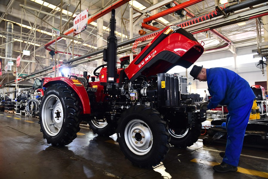 A staff member works on an assembly line at a farm machinery manufacturing company in Jining City, east China's Shandong Province, Feb. 15, 2022. (Xinhua/Guo Xulei)