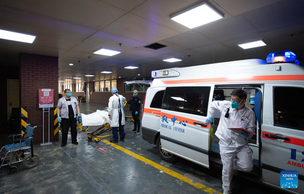 A patient is transferred by an ambulance outside the emergency department of Beijing Chao-Yang Hosptial in Beijing, capital of China, May 2, 2022. Amid the recent COVID-19 resurgence, staff members at Beijing Chao-Yang Hospital have been working hard to maintain efficient emergency medical services. (Xinhua/Chen Zhonghao)