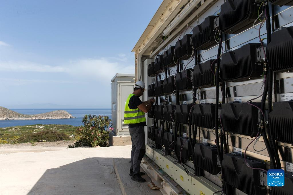 An employee works by the batteries of the energy storage system on the island of Tilos, Greece, May 9, 2022. Tilos, a small island at the southeastern Aegean with over 500 residents, is the first island in Greece to rely entirely on renewable energy to meet its energy needs. After being self-sufficient in energy through wind and solar power, the island, with about 80 percent of its waste now recycled, also aims to become a "zero waste" island. (Photo by Marios Lolos/Xinhua)