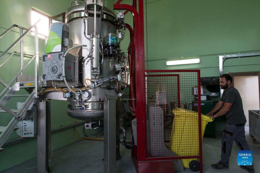 An employee of Tilos island municipality works at the recycling center of Tilos, Greece, May 9, 2022. Tilos, a small island at the southeastern Aegean with over 500 residents, is the first island in Greece to rely entirely on renewable energy to meet its energy needs. After being self-sufficient in energy through wind and solar power, the island, with about 80 percent of its waste now recycled, also aims to become a "zero waste" island. (Photo by Marios Lolos/Xinhua)