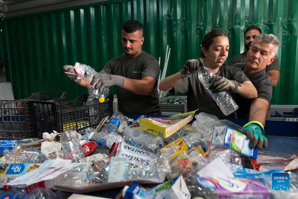 Employees of Tilos island municipality sort recycled waste at the recycling center of Tilos, Greece, May 9, 2022. Tilos, a small island at the southeastern Aegean with over 500 residents, is the first island in Greece to rely entirely on renewable energy to meet its energy needs. After being self-sufficient in energy through wind and solar power, the island, with about 80 percent of its waste now recycled, also aims to become a "zero waste" island. (Photo by Marios Lolos/Xinhua)