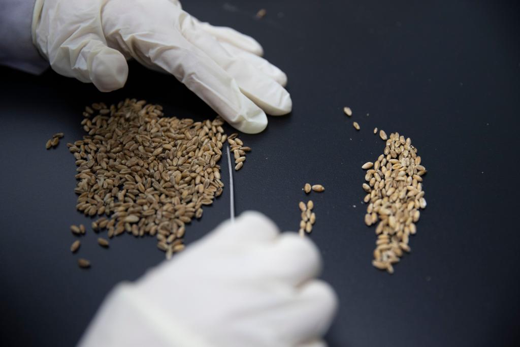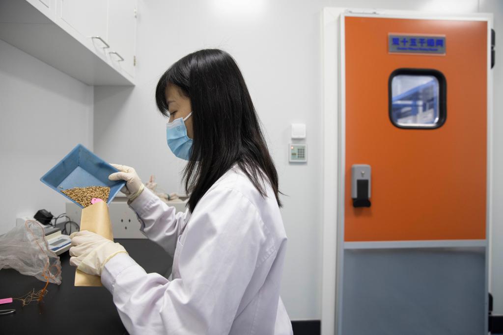 A staff member checks seeds at a seed bank for cold-region crops in northeast China's Heilongjiang Province, May 19, 2022. (Xinhua/Zhang Tao)