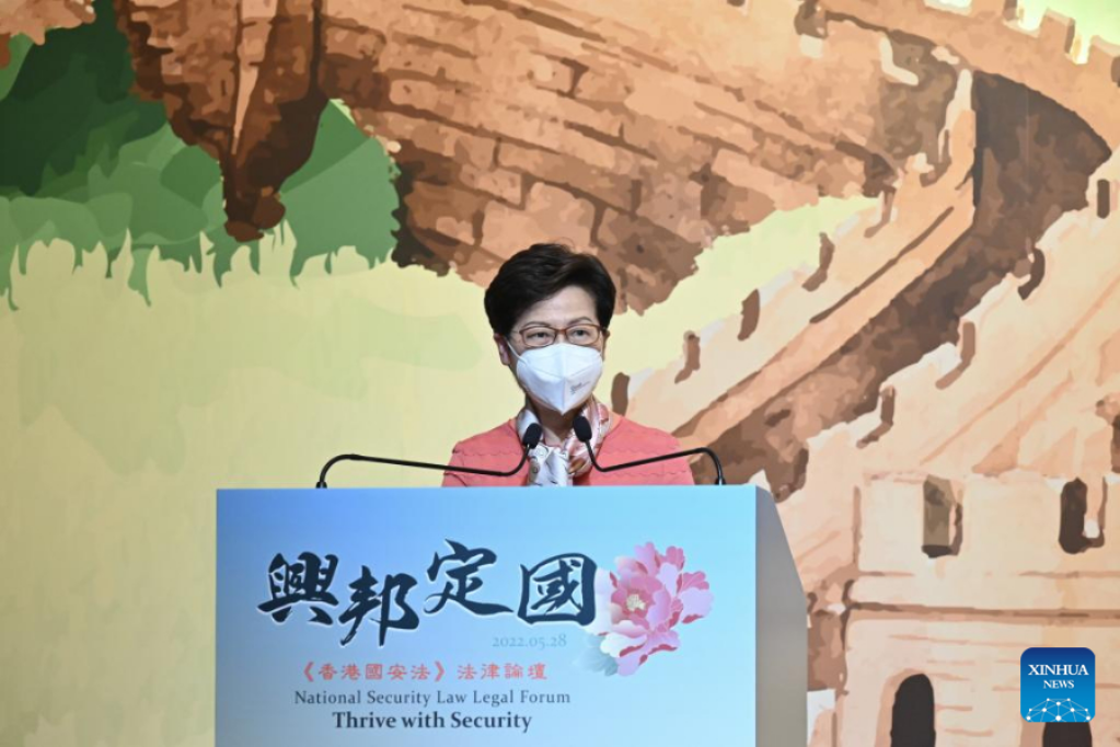 Carrie Lam, chief executive of the Hong Kong Special Administrative Region (HKSAR), addresses the opening ceremony of a legal forum on the national security law in Hong Kong, south China, May 28, 2022. (Xinhua)