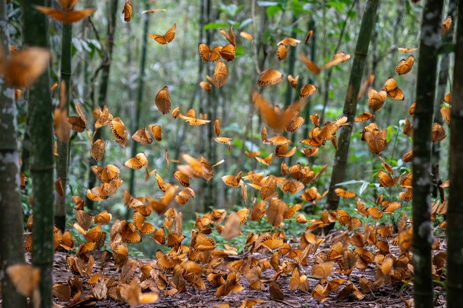 Photo taken on June 9, 2022 shows butterflies in the Honghe butterfly valley in southwest China's Yunnan Province. As of Thursday, hundreds of millions of butterflies began to emerge from chrysalises in the Honghe butterfly valley in southwest China's Yunnan Province, forming a rare ecological spectacle. (Xinhua/Hu Chao)