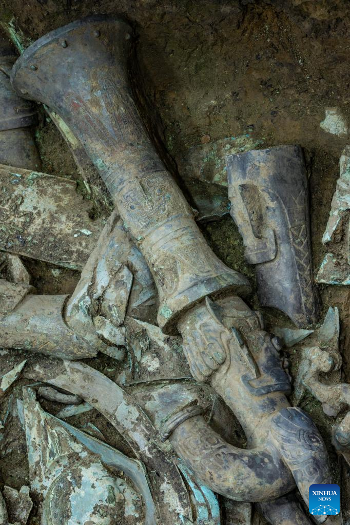 Photo taken on June 1, 2022 shows scattered parts of a newly unearthed bronze sculpture at the No. 8 sacrificial pit at the Sanxingdui Ruins site in southwest China's Sichuan Province.