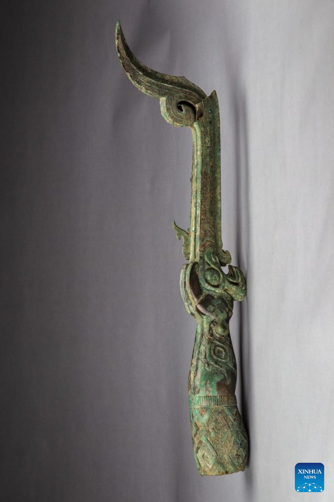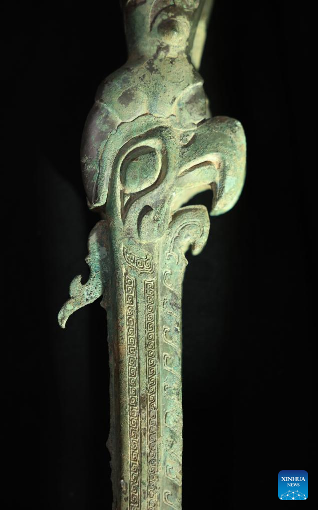 Photo taken on June 15, 2022 shows a bronzeware part that was unearthed from the No. 2 sacrificial pit in 1986 at the Sanxingdui Ruins site in southwest China's Sichuan Province.