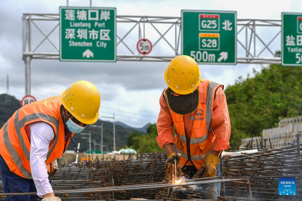People work at a construction site of a highway passing through eastern areas in Shenzhen, south China's Guangdong Province, June 17, 2022.