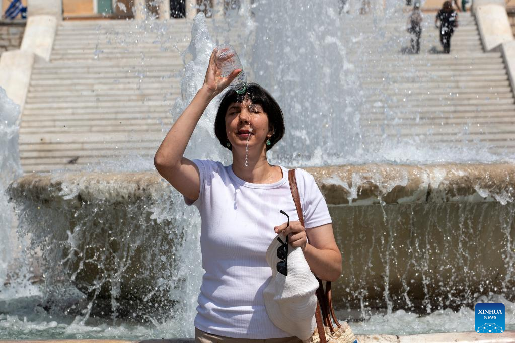 A woman pours water on her head during a heatwave in Athens, Greece, on June 22, 2022. (Xinhua/Marios Lolos)