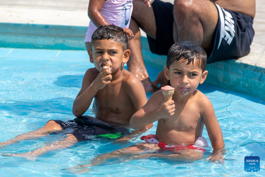 Children have ice creams in a fountain during a heatwave in Athens, Greece, on June 22, 2022. (Xinhua/Marios Lolos)