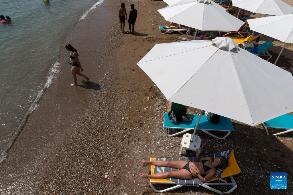 People spend time on a beach during a heatwave in Athens, Greece, on June 22, 2022. (Xinhua/Marios Lolos)