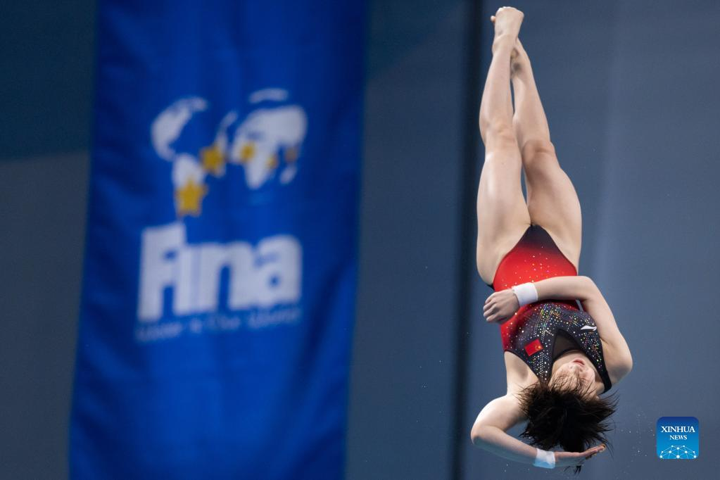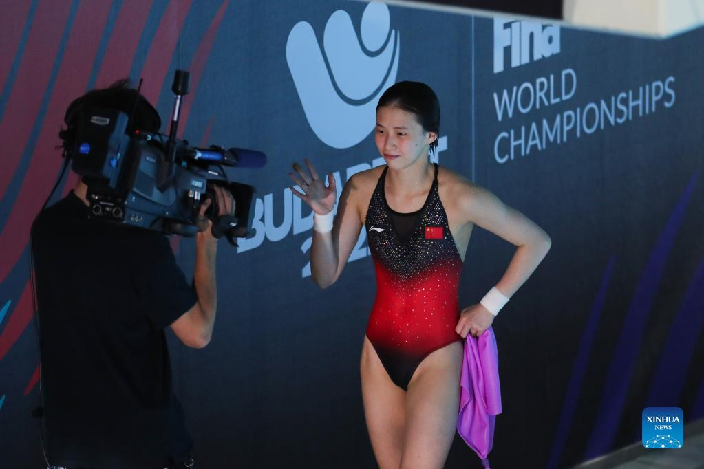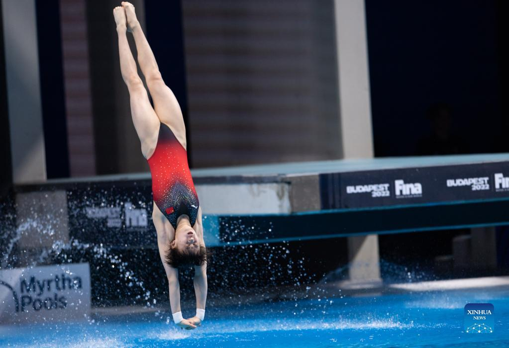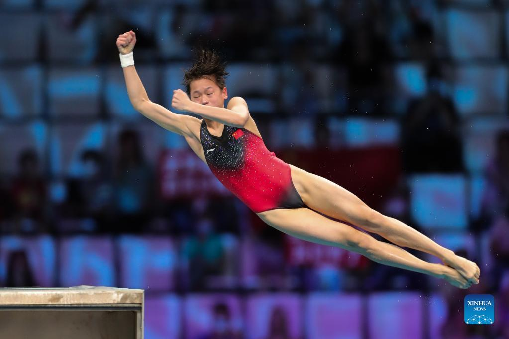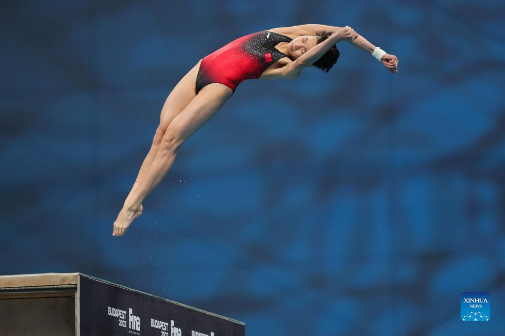 Quan Hongchan of China competes during the Women's 10m Platform semifinal of Diving at the 19th FINA World Championships in Budapest, Hungary, June 26, 2022. (Xinhua/Zheng Huansong)