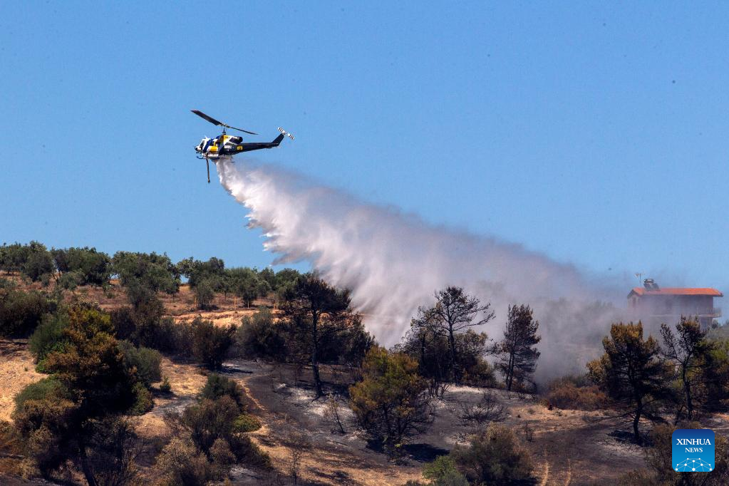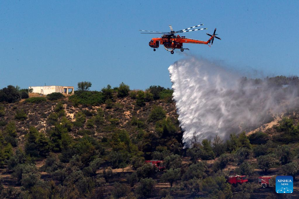 A firefighting helicopter douses wildfires in Schimatari, Greece, on July 4, 2022. (Xinhua/Marios Lolos)