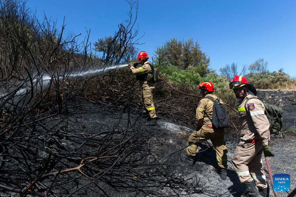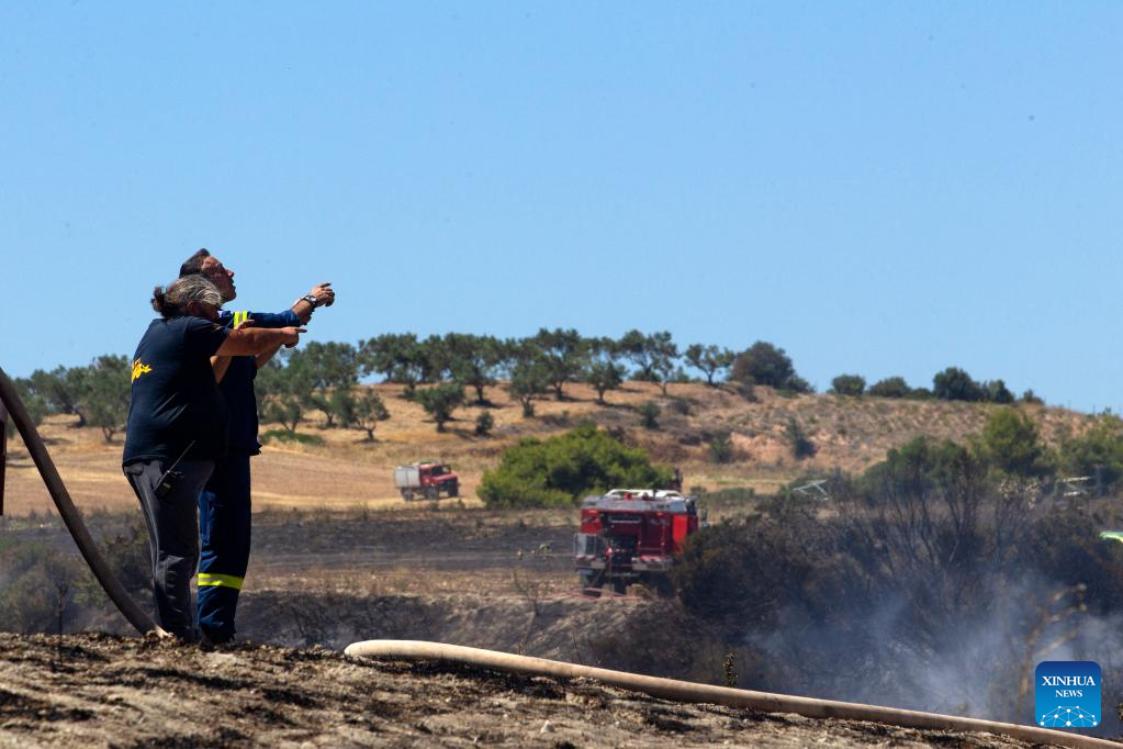 Firefighters battle a wildfire in Schimatari, Greece, on July 4, 2022. (Xinhua/Marios Lolos)