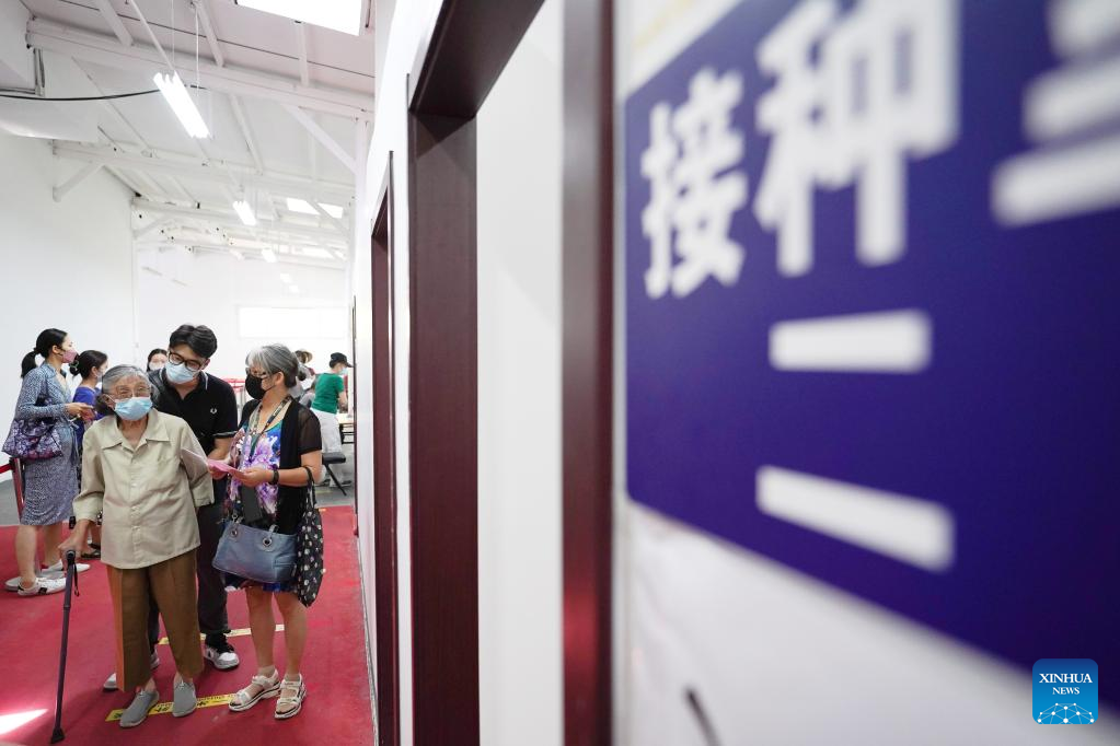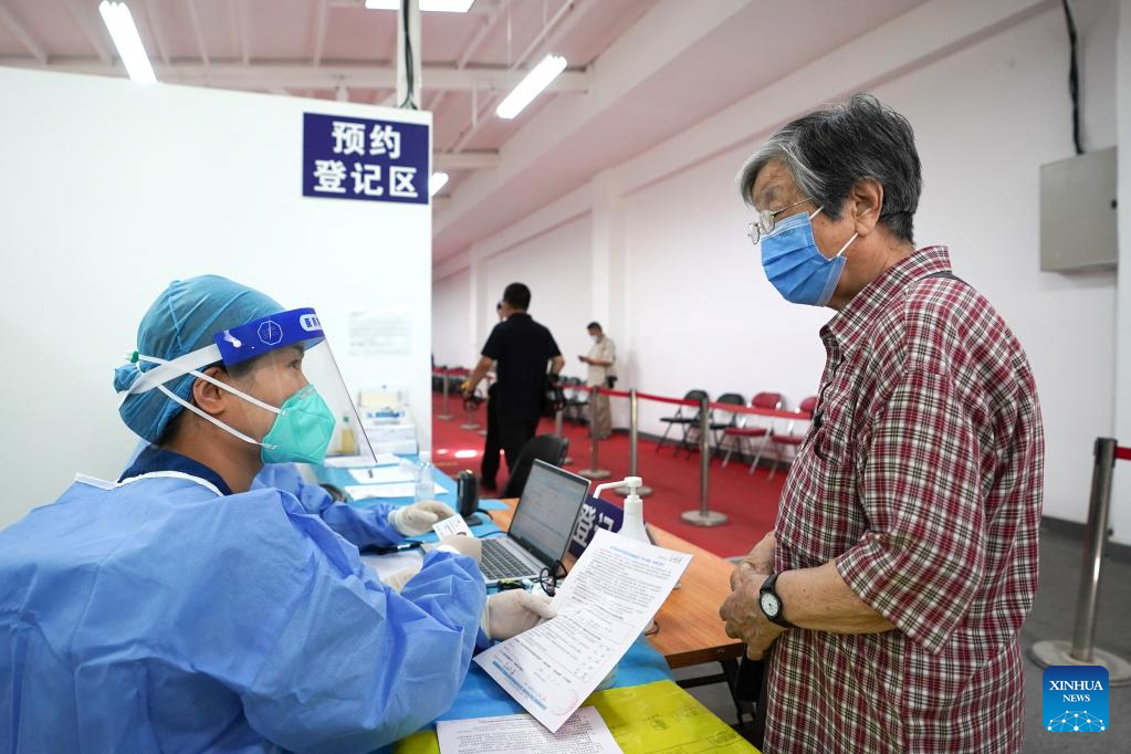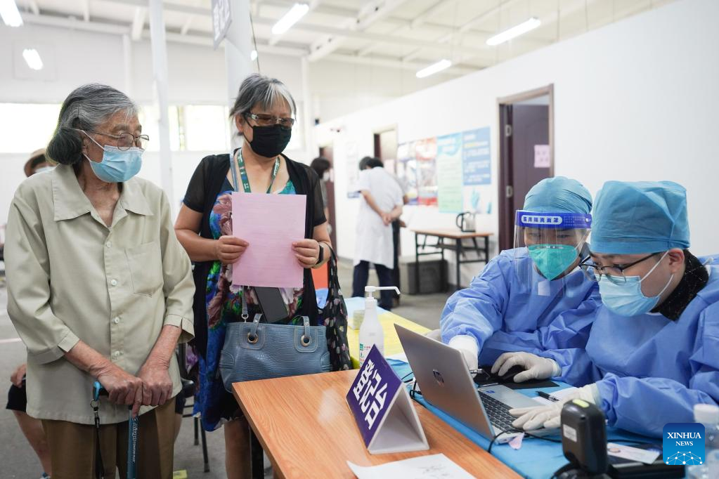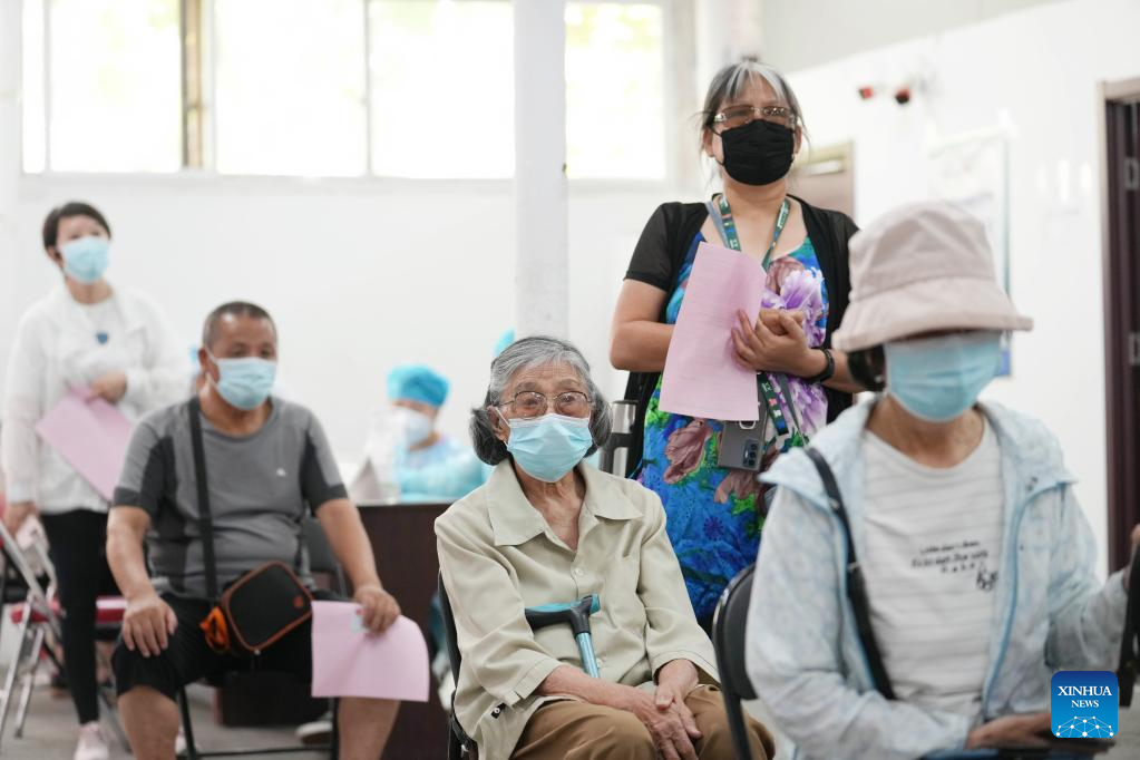 An 89-year-old citizen (C) waits to receive a booster shot of COVID-19 vaccine at Aoyuncun Subdistrict in Chaoyang District, Beijing, capital of China, July 13, 2022. Inoculation of the COVID-19 vaccine for the elderly has steadily advanced in Beijing. (Xinhua/Ju Huanzong)